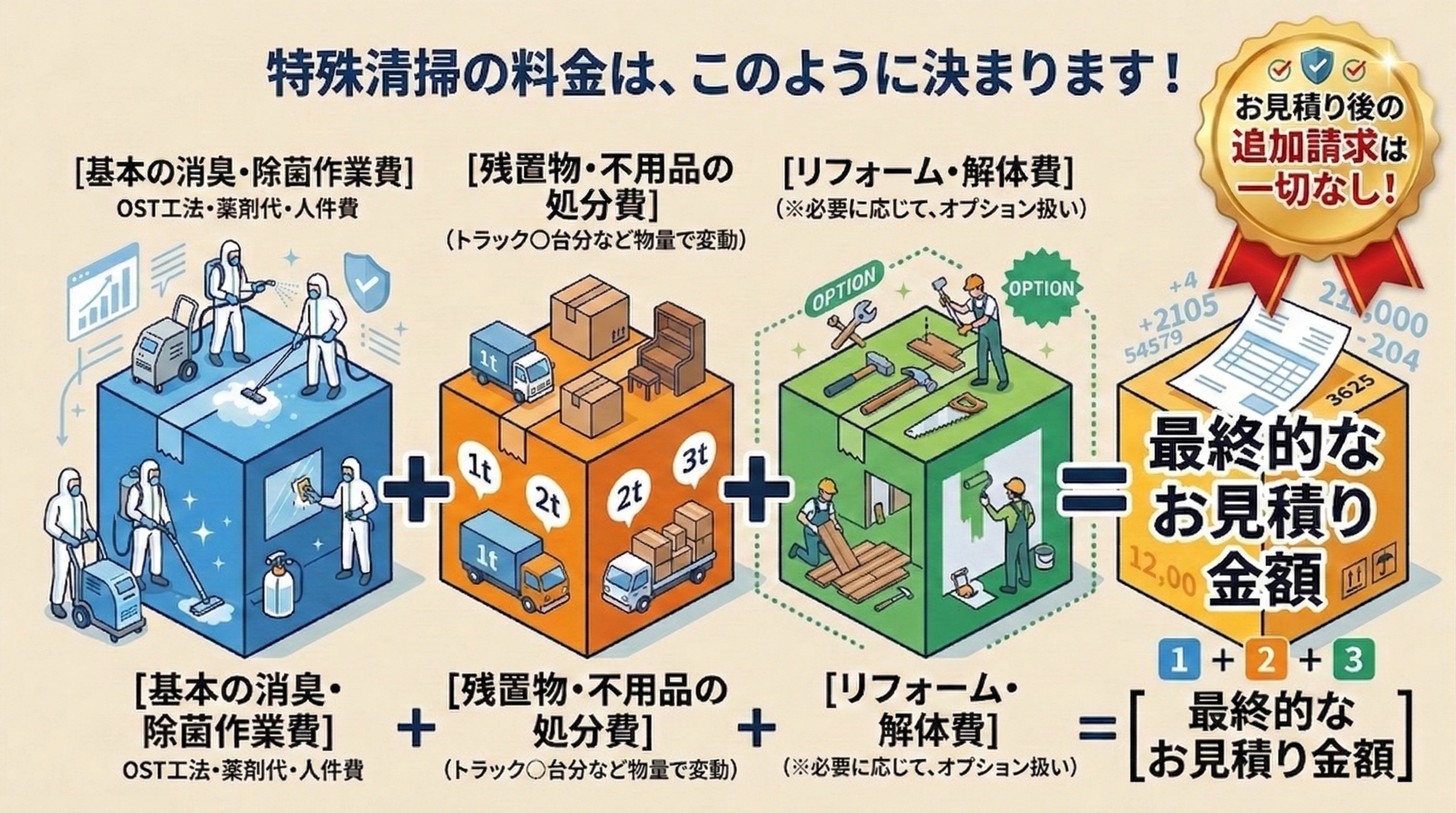 上記は最低料金の目安です。体液の浸透具合、作業日数、追加の解体作業(床材の剥がし等)の有無によって最終的な料金は変動します。お見積書をご提示した後の追加料金は一切発生いたしませんのでご安心ください。